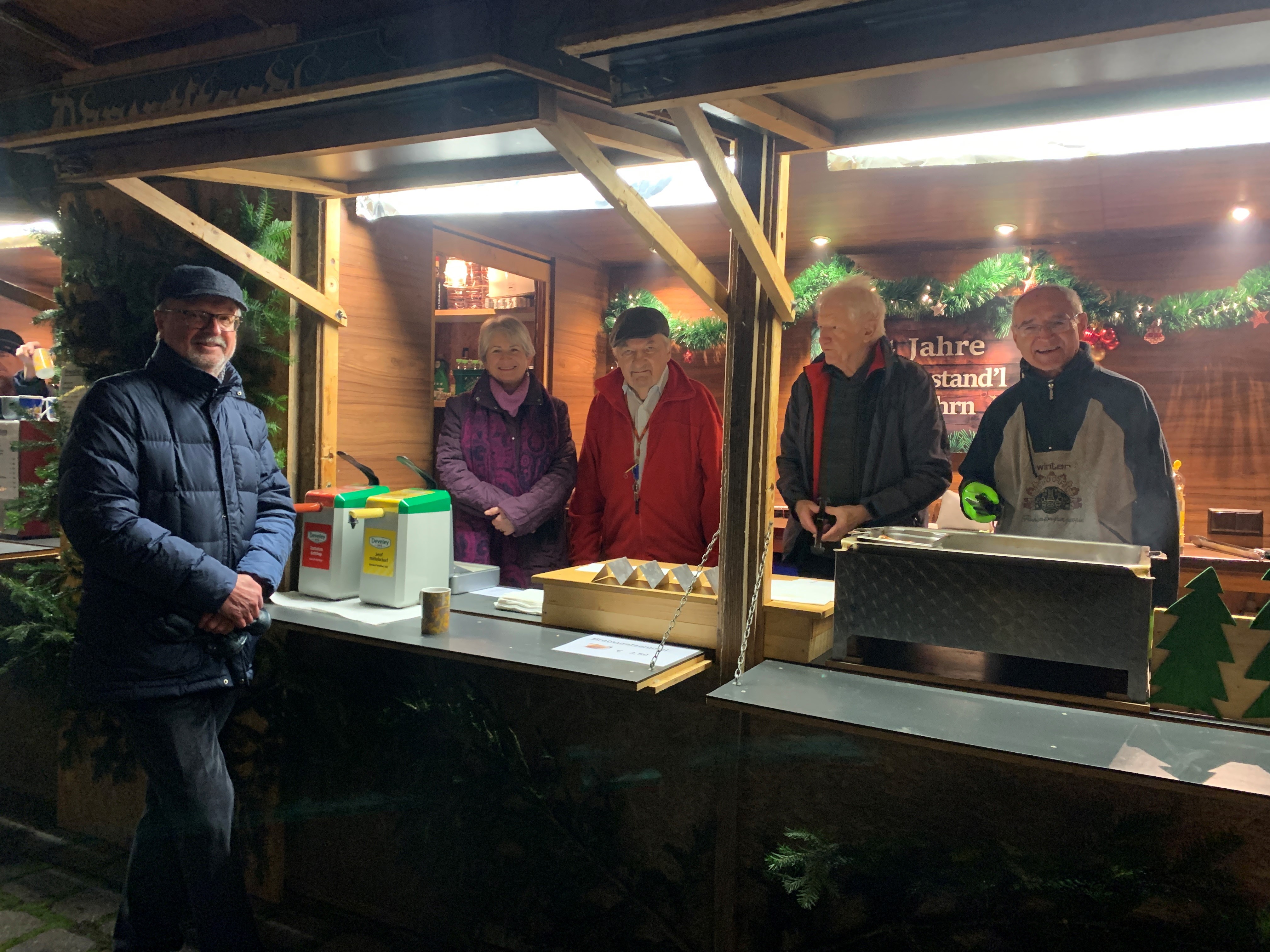 Jeweils Montag, 08.12. bis Freitag,12.12. und von Montag, 15.12. bis Freitag, 19.12., immer 17 bis 21 Uhr, verkauft ein Team von rund 15 Ehrenamtlichen am „Standl“ Bratwurstsemmeln, Stollen und Lebkuchen sowie den obligatorischen Glühwein, Kinderpunsch und weitere Getränke.