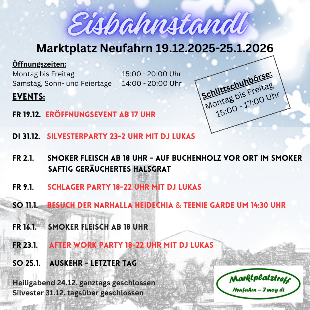 Die Eisbahn wird insgesamt von 19.12.2025 über den Jahreswechsel bis einschließlich 25.01.2026, also für insgesamt fünf Wochen in bewährter Kooperation mit bzw. unter Bereitstellung der Technik durch das ortsansässige Unternehmen Climate Energy auf dem hinteren Teil des Neufahrner Marktplatzes aufgebaut. Groß und Klein sind zum Schlittschuhlaufen einladen. Also, schon mal die Schlittschuhe aus dem Keller zu holen!