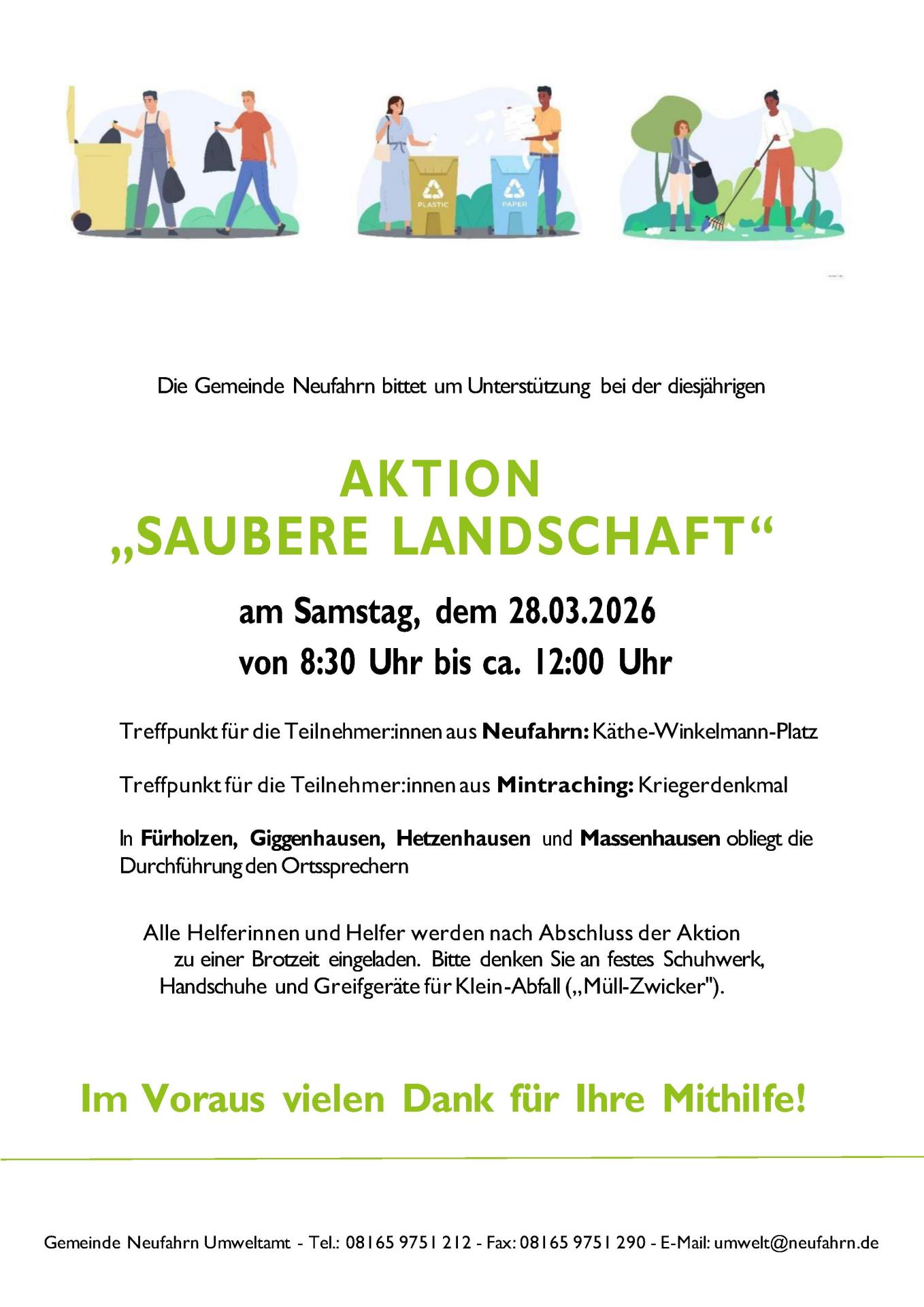 Alle Helferinnen und Helfer werden nach Abschluss der Aktion zu einer Brotzeit eingeladen. Bitte denken Sie an festes Schuhwerk, Handschuhe und Greifgeräte für Klein-Abfall („Müll-Zwicker").