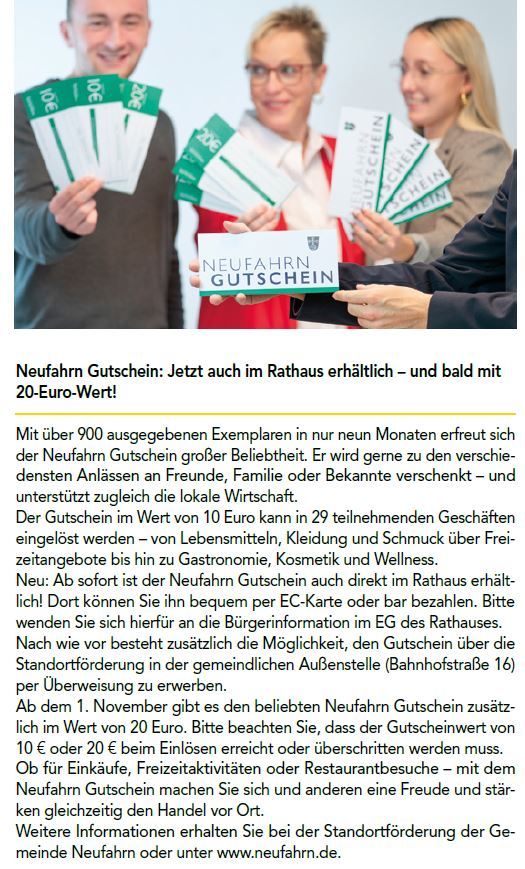 - Eine Neuauflage der Neufahrn Gutscheine in einer praktischen 20€-Stückelung ist seit November 2025 in allen teilnehmenden Verkaufsstellen zusätzlich erhältlich.